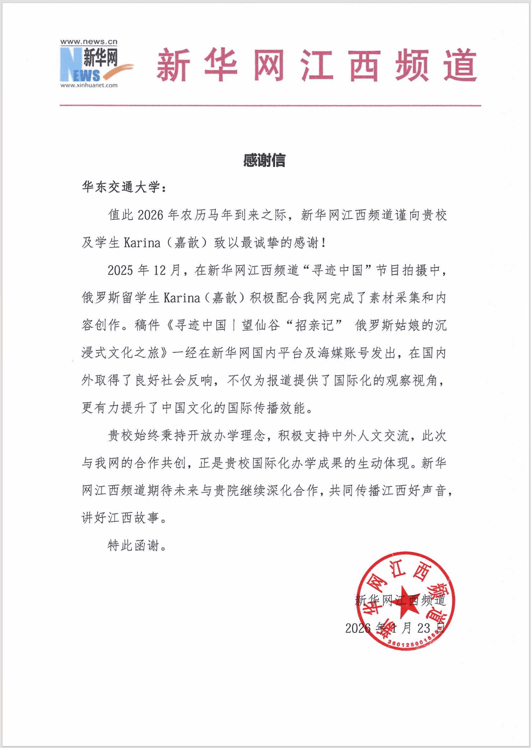 近日,我校收到新华网江西频道发来的感谢信,信中对我校俄罗斯留学生Karina(嘉歆)在“寻迹中国”节目拍摄过程中的积极参与和出色表现给予高度评价,并对我校在国际文化交流与传播方面的持续努力与扎实成效表示充分肯定。